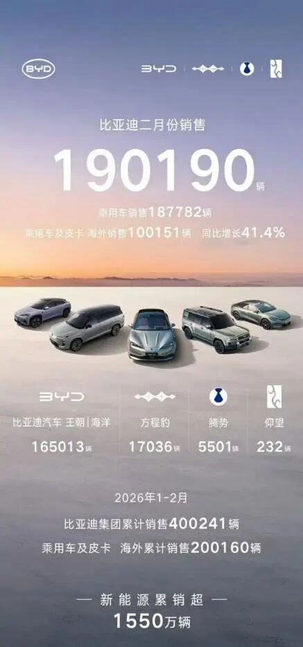 最近几年,比亚迪在全球限制内的新能源汽车赛说念上攻城拔寨,无东说念主能敌,把也曾的自主品牌老老迈祯祥汽车甩在了死后。2025年,比亚迪全年销量冲破460万辆,其中国外售量冲破100万辆,成为中国新能源汽车的一面旗子。但是,2026年开年两个月,比亚迪霎时出现了失速。从举座销量来看,比亚迪在2月份同比出现35%的下滑,而本年1-2月,比亚迪累计销量400241辆,累计同比着落35.80%。值得一提的是,比亚迪2月份销量低于20万辆,更是比年来王人未始出现过的形式。