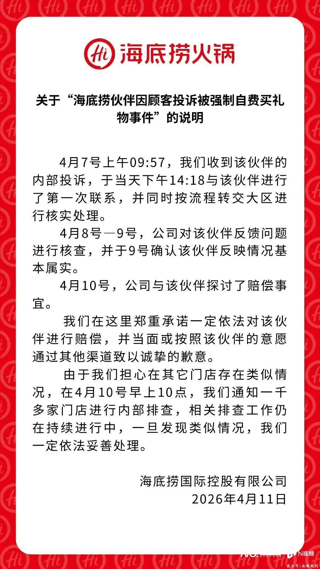 此事在外交平台激发烧议并冲上了微博热搜榜。4月11日下昼,海底捞通过官方微博发布了情况讲明,承认“海底捞伙伴因主顾投诉被强制私费买礼物”一事属实。