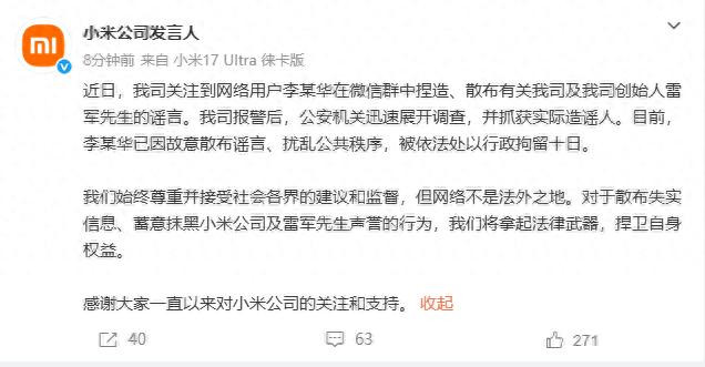 4月26日,小米公司发言东谈主发文称:“近日,我司善良到相聚用户李某华在微信群中执造、散播干系我司及我司首创东谈主雷军先生的流言。我司报警后,公安机关马上张开访问,并抓获骨子指责东谈主。当今,李某华已因特地散播流言、扯后腿各人次第,被照章处以行政拘留旬日。”