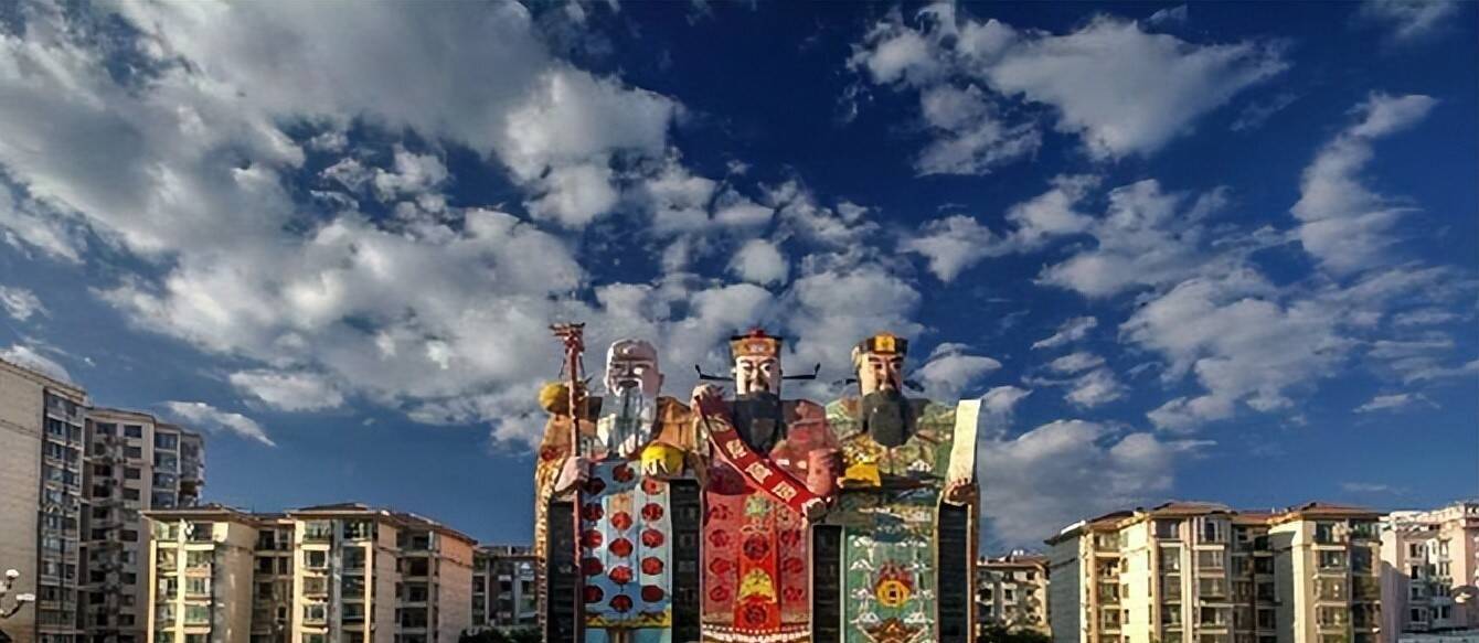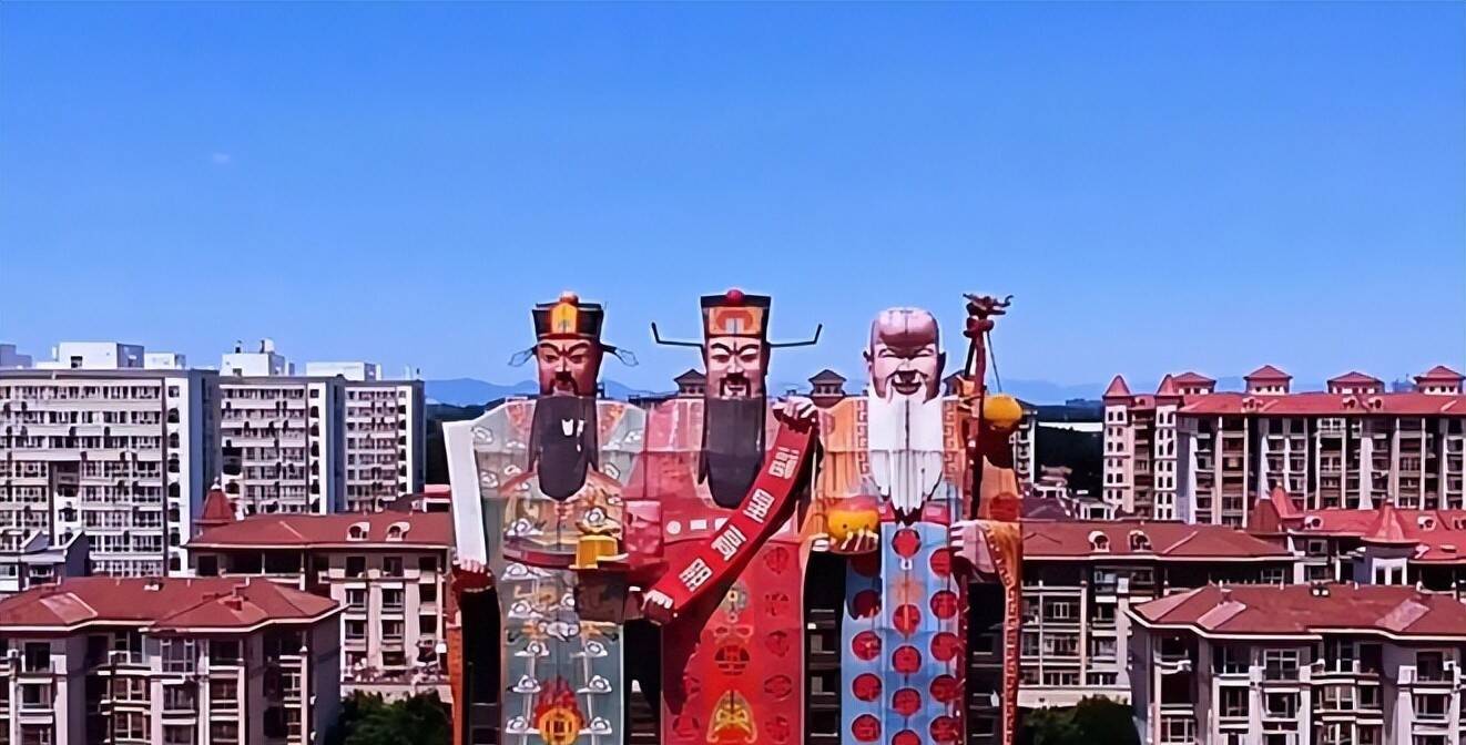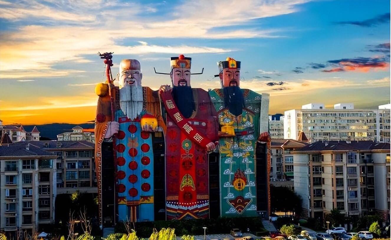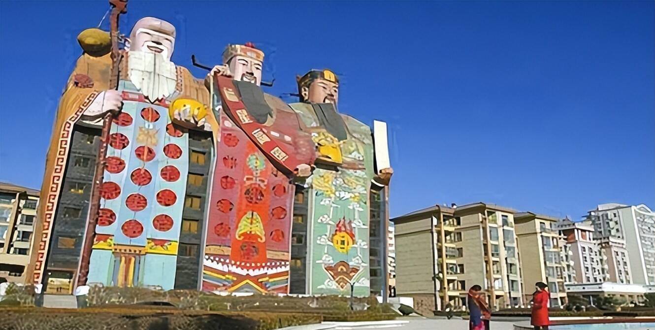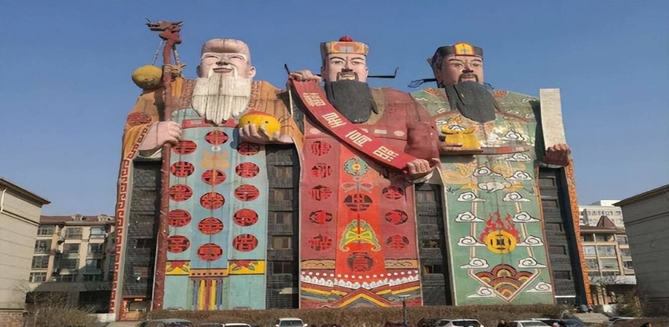 除了上头这两座,还有一座极具辨识度的建筑,外形都备照着福禄寿三仙打造,官方称号是皇帝大旅店,坐落在北京东郊皇帝湖畔,距离京城仅三十分钟车程。这座建筑的面部色调、衣饰细节描画传神,和我们平时在年画、雕刻上看到的福禄寿三仙险些通常。