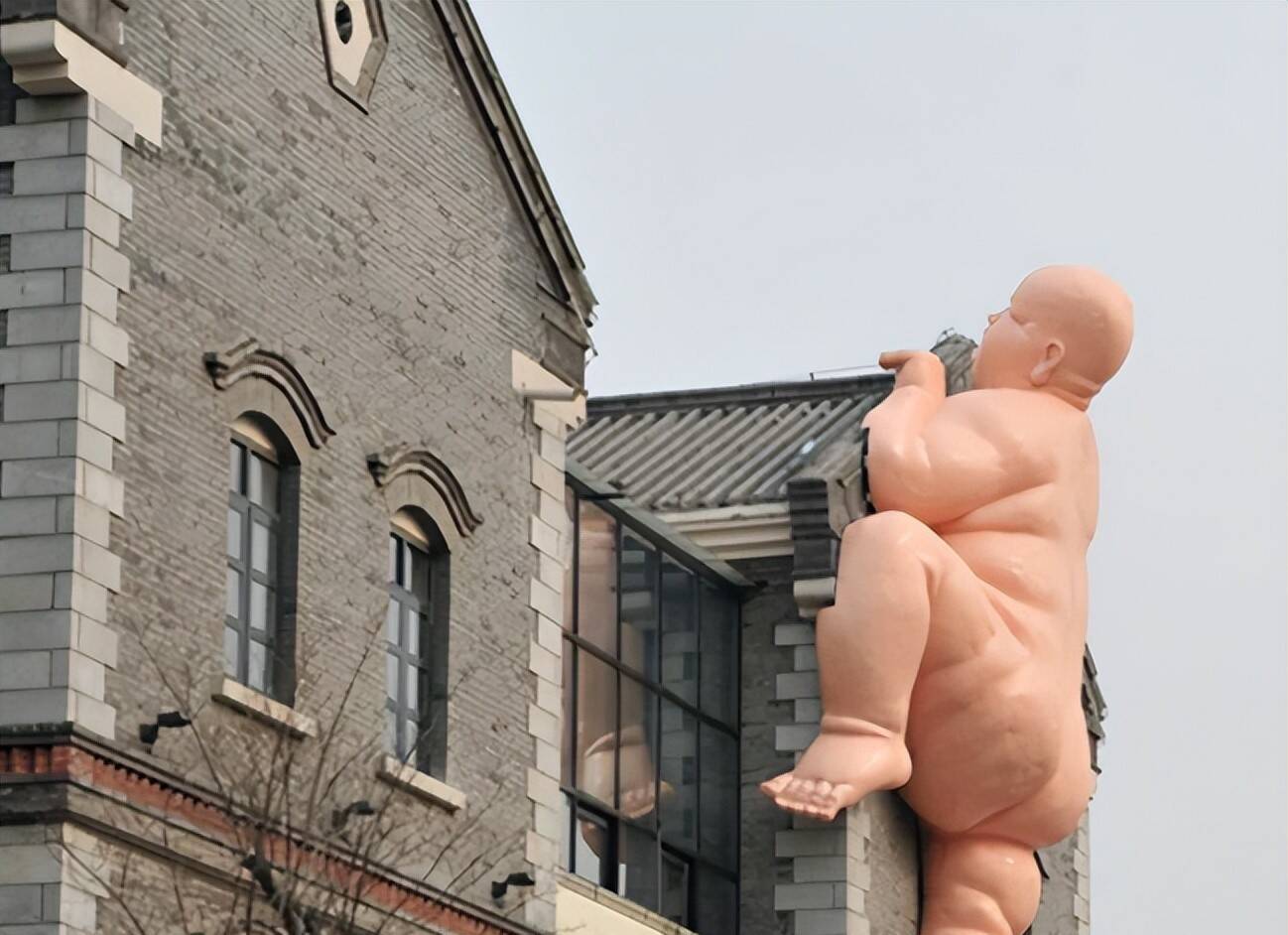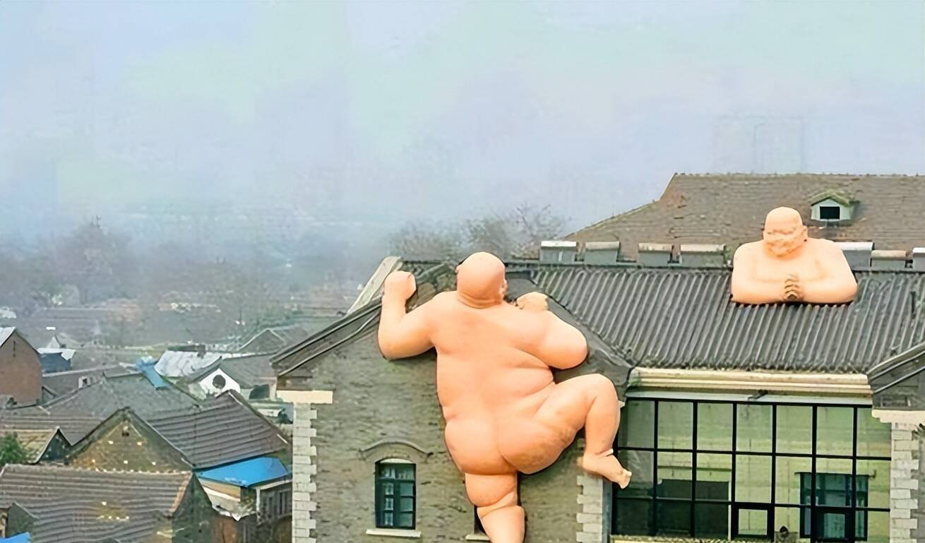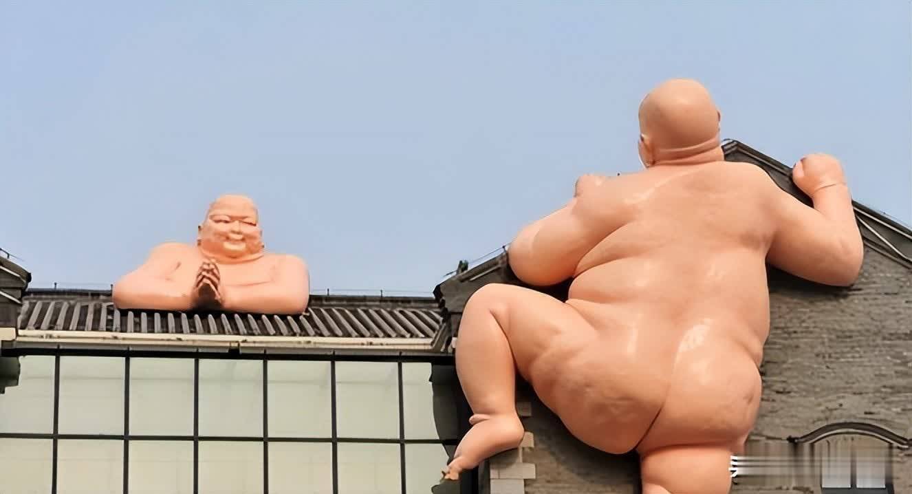 一侧是只须上半身、双手合十的雕像,朝着对面望去;另一侧是一尊齐备的雕像,肉嘟嘟的没穿穿戴,双手扒着房顶角落,一只脚上翘,像是在接力往上爬。